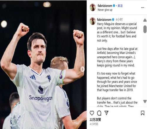 雷速体育10月22日报道宣称 今天著名转会记者罗马诺在社媒发表长文,谈到了曼联中后卫马奎尔。罗马诺对马奎尔大加赞扬,表示马奎尔虽然一直遭遇谩骂等不公正对待,但他始终保持平和,坚持不懈,努力追求梦想,为球队奉献自己的一切。
