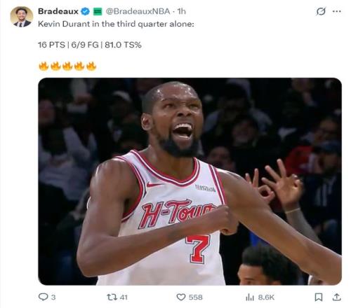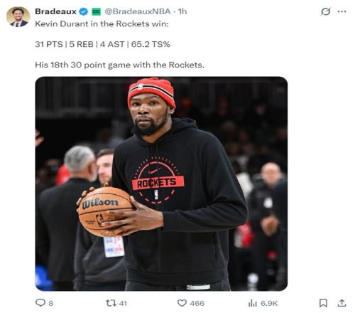 这场比赛伊森、芬尼-史密斯两个锋线因为背靠背要轮休,杜兰特需要承担更多的登场任务,上半场KD拿到12分不温不火,但第三节是他引来一波流,他单节打满12分钟,9中6,三分5中2,拿到16分3篮板1助攻,火箭一波35-24打崩老鹰。