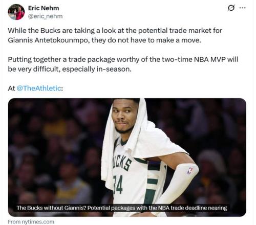 在这种情况下,The Athletic雄鹿队记Eric Nehm晒出潜在8换2交易方案,具体如下:
