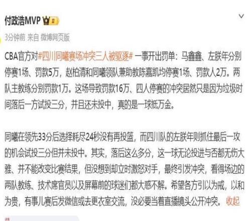 没想到,一场普普通通的常规赛,双方球员居然会在比赛最后垃圾时间阶段爆发大规模冲突,领先一方的球员因为不满落后方球员最后一投出手而爆发冲突,继而大打出手,分别领到夺权被驱逐,上演了一出让人无法理解的闹剧,而更让人没想到的是,这次冲突赛后的代价竟然如此惨重,闹事双方分别吃到了CBA今天早上开出的重磅禁赛+罚款处罚。