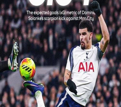 在今天凌晨进行的英超第24轮比赛中,热刺主场2-2战平曼城,其中索兰克在第70分钟打进了一记蝎子摆尾进球,帮助球队将比分扳平为2-2。根据天空体育的统计数据,在索兰克的这记进球中