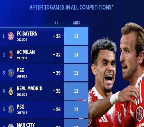 北京时间10月28日,德转统计出了单赛季各项赛事前13场比赛过后,欧洲五大联赛球队的历史10佳开局,本赛季的拜仁慕尼黑以13战全胜且净胜38球超越了1992-93赛季的AC米兰排名第一。