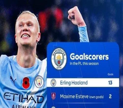 曼城队内英超射手榜:哈兰德13球,乌龙2球,其他均为1球